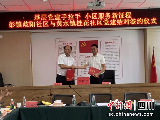 中新網(wǎng)四川新聞5月15日電 為了以黨建引領(lǐng)基層治理能力提升,努力構(gòu)建“資源共享、優(yōu)勢(shì)互補(bǔ)、互相促進(jìn)、共同提高”的黨建工作新格局,近日,雙流區(qū)彭鎮(zhèn)歧陽社區(qū)黨委與黃水鎮(zhèn)桂花社區(qū)黨委開展了以“基層黨建手拉手小區(qū)服務(wù)新征程”為主題的黨建結(jié)對(duì)共建簽約儀式,標(biāo)志著雙方黨建共建工作正式啟動(dòng)。