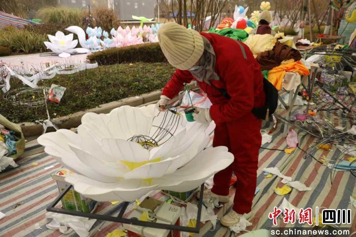 1月20日,在成都世博園國際友誼館旁的施工現(xiàn)場,200多位工人正在緊張有序地忙碌,焊工依照精細線稿焊接骨架,裱糊工巧妙還原造型與色彩,組裝師傅將各部分精準合攏……大家各司其職、互相配合,爭分奪秒將福運與年味一釘一鉚焊進燈組。