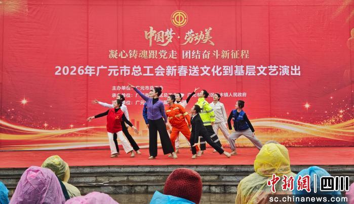 中新網(wǎng)四川新聞1月29日電 (冉金鷺 李孛孛)“咚咚鏘!咚咚鏘!”1月29日上午,廣元市朝天區(qū)羊木鎮(zhèn)羊木水香廣場上,音樂聲與笑語聲交織成熱鬧的序曲。細雨淅瀝而下,卻絲毫擋不住職工群眾的熱情,大家身著雨衣圍坐在廣場上,目光緊緊鎖定舞臺方向。隨著舞蹈《你好我好新年好》的演員活力登場,“凝心鑄魂跟黨走團結(jié)奮斗新征程”2026年廣元市總工會新春送文化到基層文藝演出正式拉開帷幕。