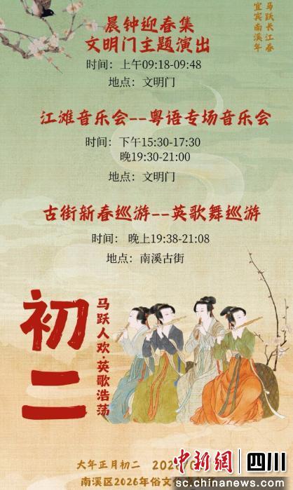 正月初三(2026年2月19日)9時18分-9時48分,在文明門舉行晨鐘迎春主題演出;15時30分-17時30分舉行江灘音樂會一一假面搖滾音樂會;19時38分-21時08分在南溪古街舉行古街新春巡游一一動漫雜耍巡游。