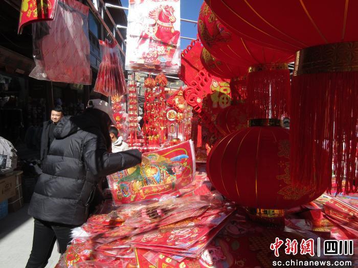 走進松潘古城,沿街商鋪與臨時攤位依次排開,形成熱鬧非凡的新春市集。從古城南街到中街,一串串紅燈籠綴滿枝頭、掛滿檐角、隨風輕搖,將古城裝點得紅火喜慶。春聯(lián)、福字、生肖掛件、鮮花盆栽琳瑯滿目,叫賣聲、歡笑聲、討價還價聲交織在一起,奏響高原古城獨有的新春序曲。