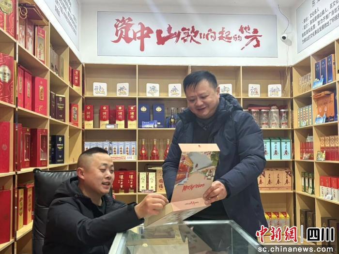 中新網(wǎng)四川新聞3月13日電(倪君 呂俊良)近日,在內(nèi)江資中縣銀山鎮(zhèn),瑞亭副食店打卡墻前暖意融融,一群年輕人正舉著手機(jī)同“資中文創(chuàng)地圖”同框拍照,店內(nèi)顧客正向老板問(wèn)詢著血橙特產(chǎn)與君子泉的禮盒搭配建議。