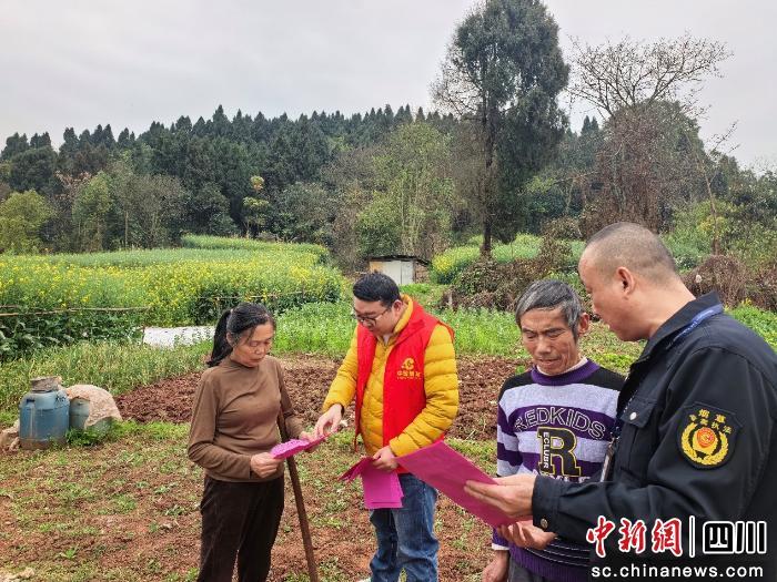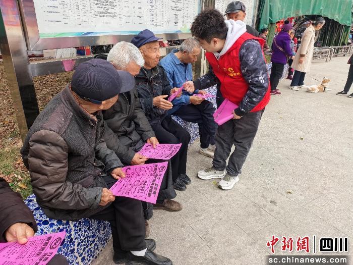 廣場一角,身著紅色志愿服的普法宣傳員許鵬正俯身與老人親切交談。深知群眾疏離生硬法條,他特意擯棄專業(yè)術語,用地道四川話將晦澀法條拆解成鄰里案例。