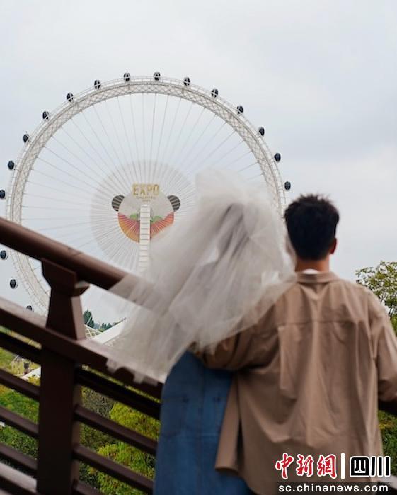 在成都世博園具有傳統(tǒng)建筑美學的錦云樓,成都東部新區(qū)設立了特色婚姻登記點。8對新人在此體驗了一場典雅莊重的中式出閣禮,將人生的“領證日”擴展為在景區(qū)美景中的“旅行紀念日”。不遠處,園區(qū)88米高的地標“天府眼”摩天輪化身巨型動態(tài)告白墻,新人們的姓名和真摯告白在輪盤上循環(huán)播放,將私人浪漫升華為與萬千游客共享的甜蜜盛事。