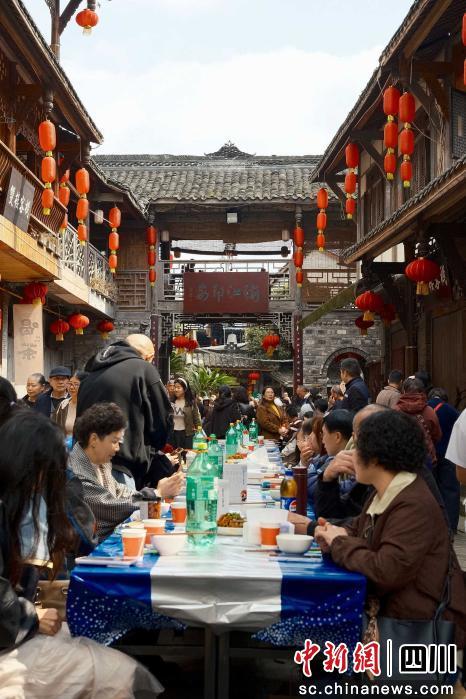 中新網(wǎng)四川新聞3月29日電 28日,2026“熊貓蜀道山”超級(jí)越野賽在彭州繼續(xù)進(jìn)行,來(lái)自全國(guó)各地的越野愛(ài)好者齊聚龍門(mén)山下,用腳步丈量“立體山水·彭派之城”的獨(dú)特魅力。作為賽事核心途經(jīng)地,通濟(jì)鎮(zhèn)以海窩子古鎮(zhèn)為“會(huì)客廳”,精心策劃“蜀王長(zhǎng)街宴”,擺下百桌“九斗碗”,用最樸素的“家宴”形式歡迎八方來(lái)賓,將賽道上的競(jìng)技激情轉(zhuǎn)化為古鎮(zhèn)里的消費(fèi)熱潮,推動(dòng)賽事“流量”變經(jīng)濟(jì)“留量”,讓參賽選手與市民游客沉浸式體驗(yàn)“彭派生活”。