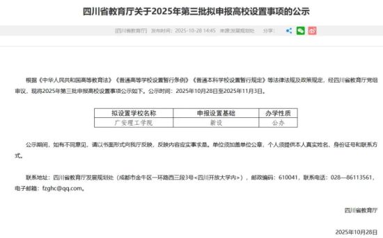 10月28日,四川省教育廳官網(wǎng)發(fā)布《關(guān)于2025年第三批擬申報(bào)高校設(shè)置事項(xiàng)的公示》,擬新設(shè)置公辦高校廣安理工學(xué)院。