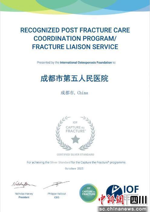 中新網(wǎng)四川新聞1月15日電(王爵)近日,成都市第五人民醫(yī)院骨科骨質疏松治療團隊獲得國際骨質疏松基金會(IOF)骨折聯(lián)絡服務(FLS)項目銀牌認證。該認證是國際骨質疏松癥管理領域的權威認可之一,標志著該院在骨質疏松性骨折防治與全程管理方面達到國際水平。