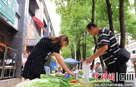 早上7點左右,西充縣城文博街“郵票市場”便逐漸熱鬧起來。40余米的人行道長街上,數(shù)十個攤位沿一側(cè)整齊排列,蔬果肉類一應(yīng)俱全。市民穿行其間,挑選心儀的商品。攤主們裝袋、稱重、收錢,一片繁忙卻井然有序。