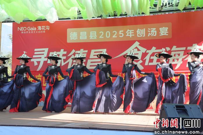 活動(dòng)以“尋味德昌食在;ā睘橹黝},精心設(shè)計(jì)了一系列沉浸式體驗(yàn)環(huán)節(jié)。當(dāng)日10時(shí),在室外舞臺(tái)上,人們遵循古老年俗舉行“殺年豬”儀式,由德高望重的長者誦念吉祥話語,祈愿來年風(fēng)調(diào)雨順、家宅安康,為活動(dòng)注入了濃厚的傳統(tǒng)節(jié)慶氛圍。緊隨其后的文藝匯演,涼山州歌舞團(tuán)“送戲下鄉(xiāng)”,以特色歌舞與民樂演奏,在冬日暖陽下傳遞著民族文化的靈動(dòng)與熱情。