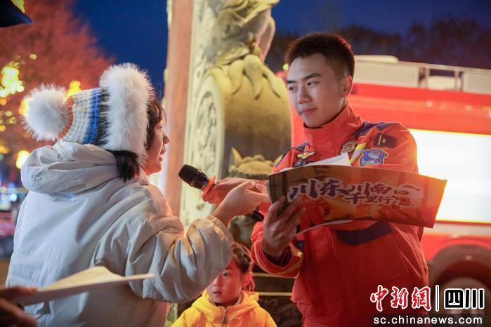 1月19日晚的現(xiàn)場活動,聞聲而來的游客與市民齊聚一堂,紛紛打開手機(jī)閃光燈,跟隨音樂節(jié)拍揮舞,目光聚焦于擺滿防火宣傳文創(chuàng)產(chǎn)品的區(qū)域。四川消防救援機(jī)動總隊(duì)“蜀藍(lán)”文藝輕騎兵率先帶來精彩文藝表演,小提琴獨(dú)奏落幕后,主持人馬文韜即刻開啟有獎競猜環(huán)節(jié)。
