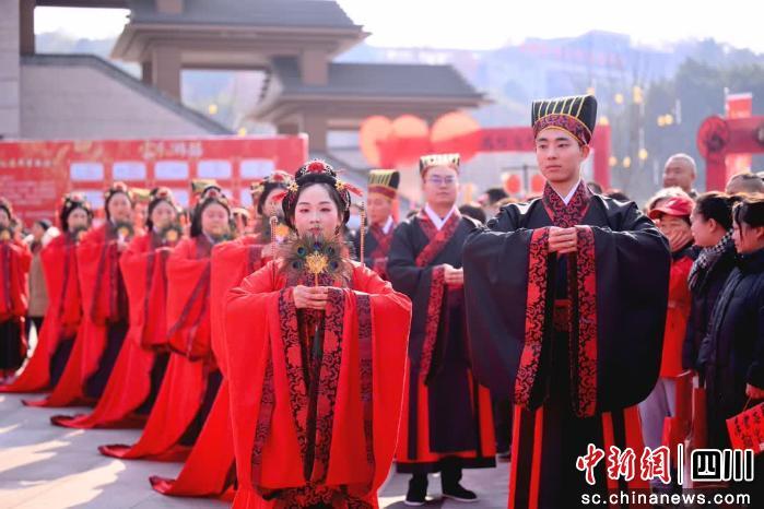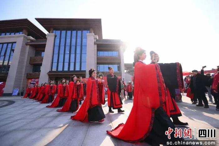 中新網(wǎng)四川新聞2月13日電 (李靜潔 李洋 肖鵬)2月12日,綿陽市游仙區(qū)開展“富樂游囍”婚戀禮遇行動(dòng)啟動(dòng)儀式暨芙蓉漢城漢式集體婚禮活動(dòng)。10對(duì)新人身著典雅漢服,在古禮浸潤與眾人的祝福中,許下相守一生的真摯諾言,攜手開啟婚姻生活的美好篇章。