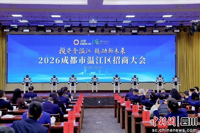 中新網(wǎng)四川新聞2月28日電 隨著《快樂崇拜》的動(dòng)感節(jié)奏響起,8臺(tái)整齊列隊(duì)的黑白配色、腳踏“黃靴”的智能機(jī)器人,擺臂、扭胯、步伐切換一氣呵成,機(jī)械的利落與舞蹈的韻律完美交融……這不是馬年春晚的機(jī)器人表演舞臺(tái),而是2026成都市溫江區(qū)招商大會(huì)的現(xiàn)場。