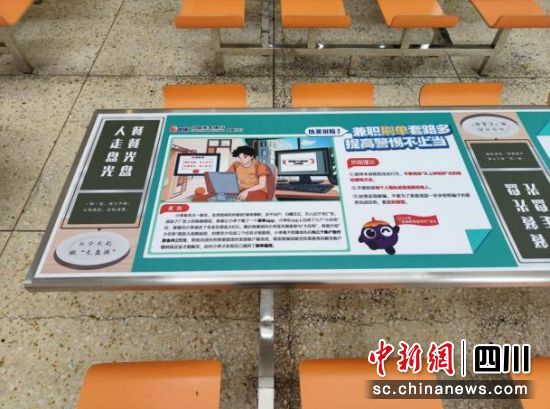 該行圍繞與大學(xué)生密切相關(guān)的電信詐騙及非法金融活動(dòng)案例,以年輕人喜歡的漫畫形式制作成5個(gè)內(nèi)容、不同顏色的以案說險(xiǎn)桌貼,在西華大學(xué)本部的食堂餐桌上進(jìn)行布放,包括:“兼職刷單套路多,提高警惕不上當(dāng)”“遠(yuǎn)離非法校園貸,理性消費(fèi)不亂貸”“警惕虛假平臺(tái),游戲交易詐騙”“警惕冒充公檢法詐騙”“遠(yuǎn)離洗錢陷阱,不做洗錢‘工具人’”。每當(dāng)在校師生在食堂用餐時(shí),色彩顯眼的桌貼可吸引就餐人員瀏覽和學(xué)習(xí)上面的典型案例和風(fēng)險(xiǎn)提示,助力青年群體樹立正確的金錢觀、價(jià)值觀和財(cái)富觀,正確判斷、自覺抵制各種違法違規(guī)金融活動(dòng)。