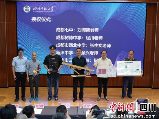 與會校領(lǐng)導(dǎo)嘉賓分別為基礎(chǔ)教育分會物理專委會主任、副主任、秘書長、副秘書長頒發(fā)了聘書,向創(chuàng)新實(shí)驗(yàn)研究中心委員會主任、委員、特邀研究員、中心法律顧問頒發(fā)了聘書。成都七中劉滪顥、成都樹德中學(xué)屈川、成都市西北中學(xué)張生文、新津中學(xué)汪順興、崇州市三江中學(xué)校何磊向創(chuàng)新實(shí)驗(yàn)研究中心進(jìn)行了自制儀器公益推廣授權(quán)。
