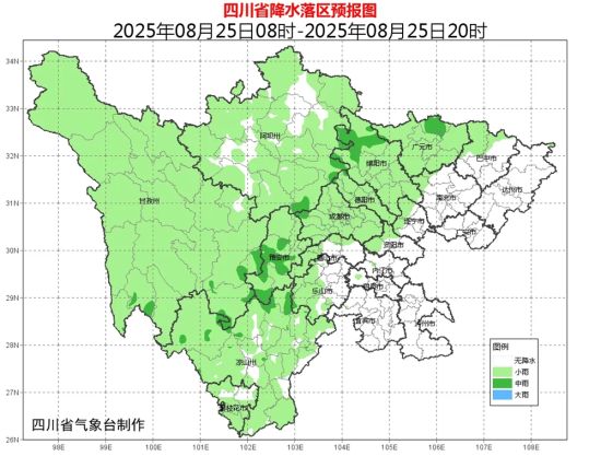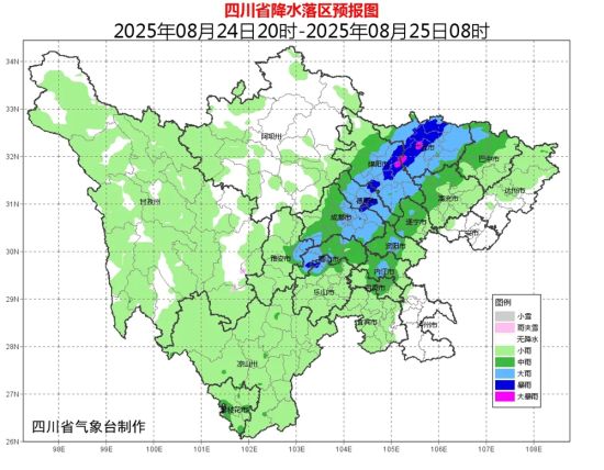 8月24日20時(shí)到25日20時(shí):廣元、綿陽(yáng)、德陽(yáng)3市,成都東部南部,雅安東部,眉山、樂(lè)山、內(nèi)江、資陽(yáng)、遂寧5市西部有大雨到暴雨(雨量40~90毫米),局部大暴雨(雨量150~180毫米),最大小時(shí)雨強(qiáng)40~70毫米,并伴有短時(shí)雷雨大風(fēng)。