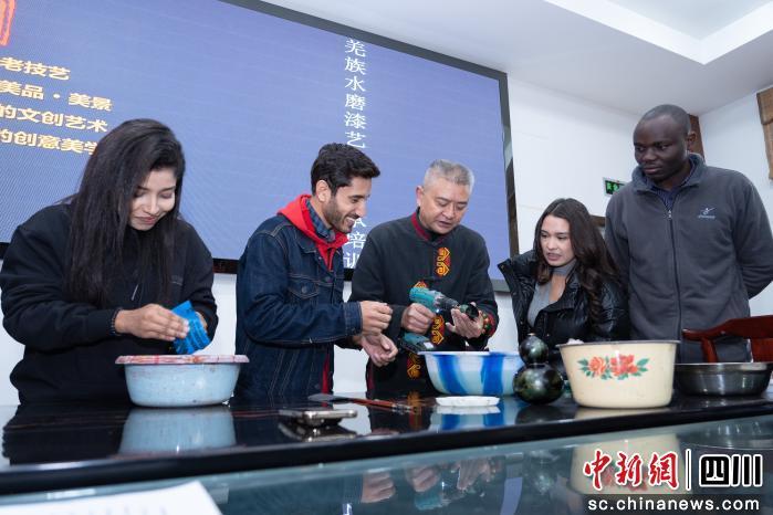 在北川羌族自治縣古羌水磨漆藝傳習(xí)所,隨著傳承人朱紅志的熟練操作,留學(xué)生們被這項(xiàng)傳承五千年的非遺技藝深深吸引,對(duì)它贊不絕口。在朱紅志的指導(dǎo)下,留學(xué)生親手體驗(yàn)了電動(dòng)打磨工序。短短1分鐘,表面粗糙的小碗就變得光滑透亮,引得留學(xué)生們連連驚呼。