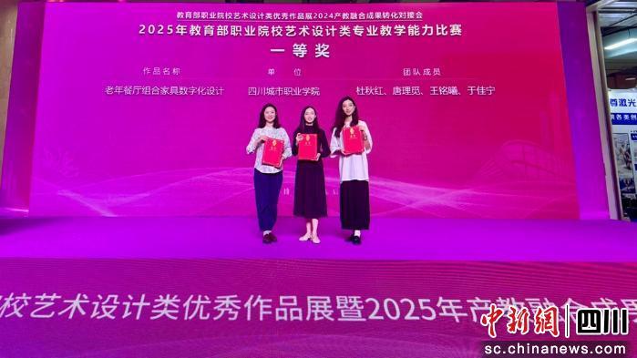 中新網(wǎng)四川新聞11月19日電 (劉忠俊 王銘曦)四川城市職業(yè)學(xué)院19日透露,該校城市建設(shè)與設(shè)計(jì)學(xué)院杜秋紅、王銘曦、唐理覓、于佳寧教師團(tuán)隊(duì)?wèi){借《老年餐廳組合家具數(shù)字化設(shè)計(jì)》教學(xué)作品,從11支參賽隊(duì)伍中脫穎而出,在2025年教育部職業(yè)院校藝術(shù)設(shè)計(jì)類(lèi)專(zhuān)業(yè)教學(xué)能力大賽上斬獲一等獎(jiǎng)。