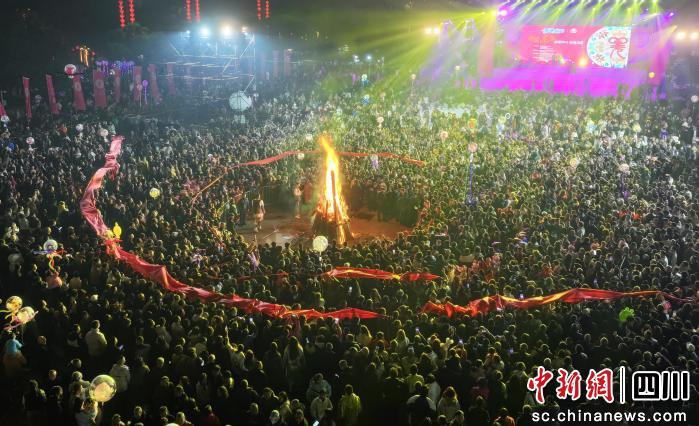 隨著羌繡省級代表性傳承人陳云珍等火把手點(diǎn)燃火把,木柴在篝火中噼啪作響,沙朗篝火聯(lián)歡活動正式開始。兩條80米長的巨型羌紅在人群中逶迤蜿蜒,游客在篝火的映照下,與當(dāng)?shù)厝罕娛掷郑瑖艋鸪鹆烁、跳起了舞,盡情釋放著內(nèi)心的歡樂與熱情,一幅民族團(tuán)結(jié)進(jìn)步的畫卷生動展開。