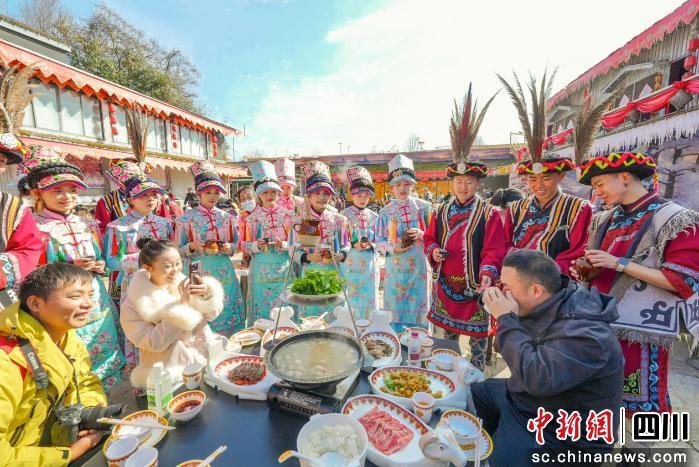 在羌情園舉行的活動(dòng)開(kāi)幕式現(xiàn)場(chǎng),身著傳統(tǒng)服飾的羌族姑娘小伙手捧醇香咂酒唱響祝酒歌,以民族禮儀迎接賓客;隨后的羌族婚禮展演還原傳統(tǒng)民俗流程,讓游客沉浸式感受羌家兒女的浪漫風(fēng)情。12時(shí)整,刨湯宴開(kāi)宴儀式震撼上演,羌家人身著盛裝跳起豐收舞蹈,以靈動(dòng)舞姿展現(xiàn)豐收喜悅、祈求風(fēng)調(diào)雨順。隨后,臘腌香腸、暖心刨湯等8菜1湯特色羌家菜品陸續(xù)上桌,熱氣與香氣彌漫全場(chǎng),地道風(fēng)味獲游客廣泛贊譽(yù)。席間,游客們舉杯共慶羌年,碰杯聲、歡笑聲交織,熱鬧非凡。
