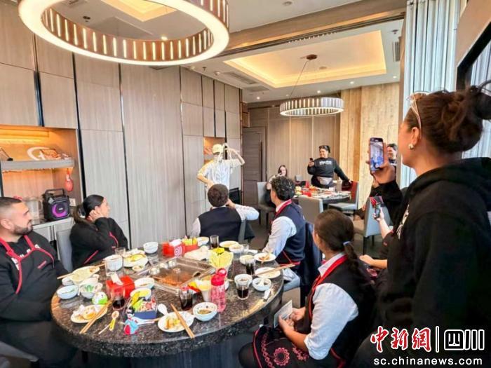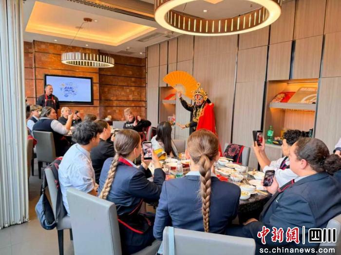 交流活動從一頓地道的火鍋開始。在海底撈簡陽門店,新西蘭毛利青少年們圍坐桌旁,對眼前翻滾的牛油紅湯,鋪滿長桌的毛肚、黃喉、鴨腸等菜品表現(xiàn)出濃厚興趣。席間,撈面表演和富含藝術(shù)特色的川劇變臉接連上演,現(xiàn)場氣氛熱烈。這場獨特的餐飲體驗,為遠道而來的客人們留下了對四川飲食文化直觀而鮮活的第一印象。