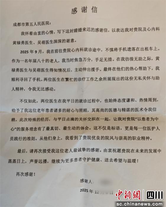 中新網(wǎng)四川新聞12月18日電 近日,成都市第五人民醫(yī)院心血管內(nèi)科收到一封來自80歲劉奶奶的感謝信。信中描寫了一次就診途中的意外插曲,讓我們看見醫(yī)護工作者在專業(yè)之外,那份自然流露的關懷與擔當。