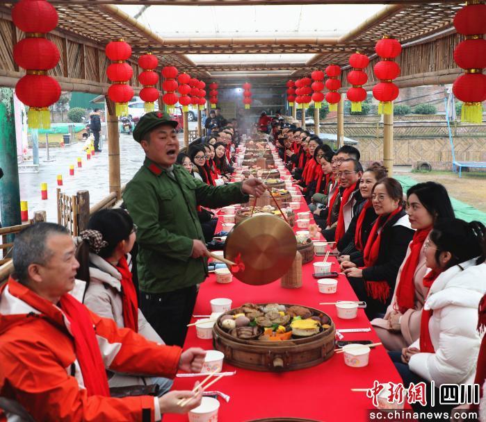 一陣鏗鏘有力、富有節(jié)奏的鑼鼓聲將人們的目光引向村落中央。循著鑼鼓聲望去,百米長的紅桌旁已坐滿游客!伴_席咯!”一聲嘹亮的鄉(xiāng)音穿透喧鬧,負(fù)責(zé)人任成松用力掀開面前碩大的籠蓋,蓬勃的白色蒸汽瞬間升騰,露出了晶瑩油亮的粉蒸肉、紋理分明的農(nóng)家扣肉。這位曾經(jīng)的在外務(wù)工者,如今是“充國蒸籠宴”的主理人。他穿梭于長桌間,看著各地游客大快朵頤,臉上是掩不住的笑意!叭,營收3.6萬元。關(guān)鍵是,在家門口就把事做成了!彼麡銓(shí)話語的背后,是鄉(xiāng)村價(jià)值被重新發(fā)現(xiàn)與激活的縮影。