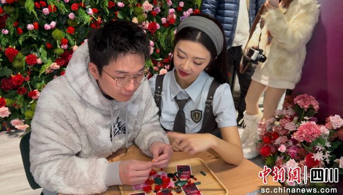 核心體驗區(qū)里,情侶們正圍坐桌前共同拼搭樂高玫瑰花。“按拼搭指南完成組件后,要通過默契配合組裝成型。”來自成都的市民李女士展示著手中的作品,她與男友花了40分鐘完成拼搭,“拼接積木時手指的觸碰,比直接送花多了份參與感!蓖瓿勺髌泛,兩人擺出指定手勢,桌面即刻投影出“玫瑰花!眲討B(tài)效果,這一“隱藏彩蛋”引發(fā)陣陣驚嘆。