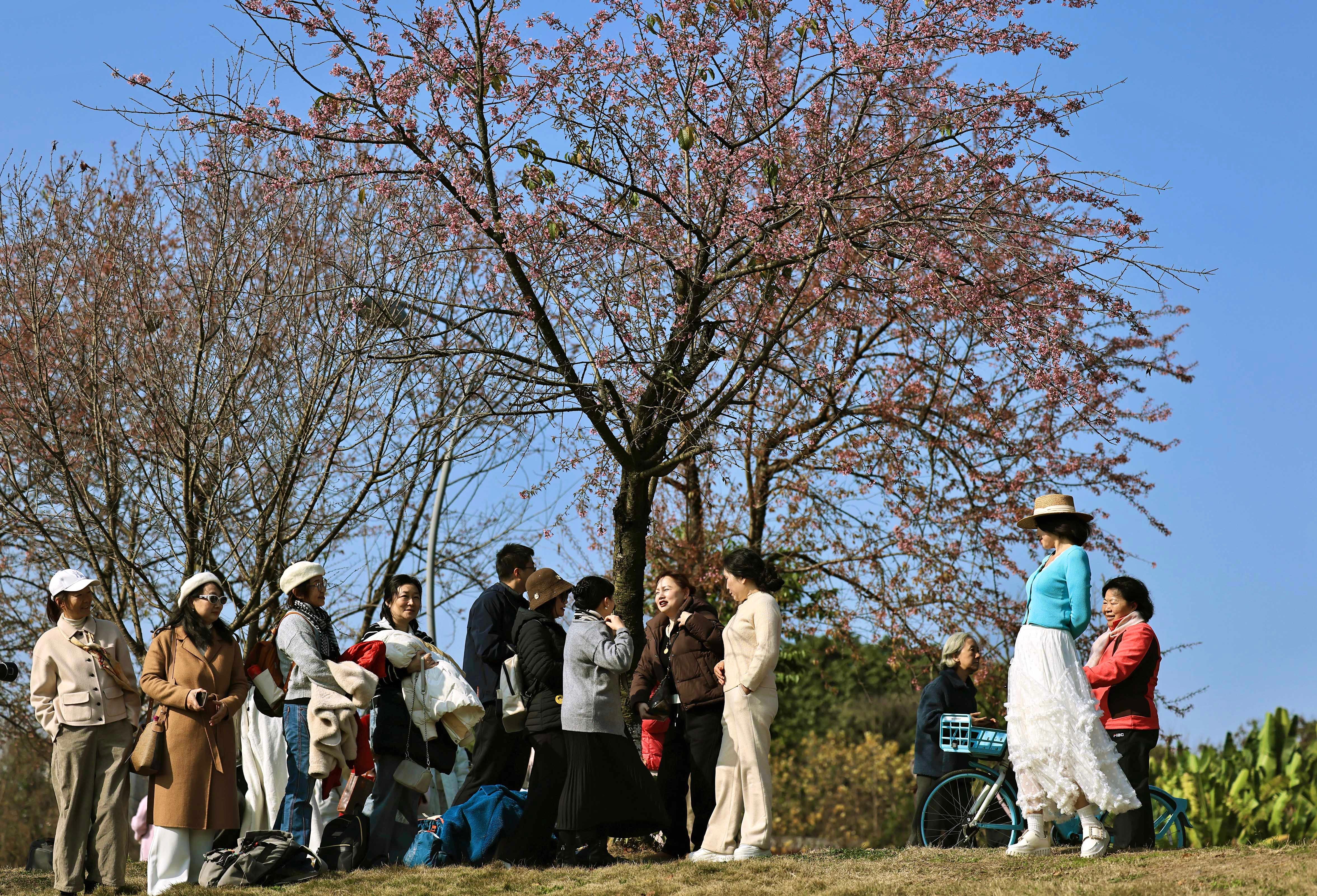 1月6日,成都市青龍湖公園的冬櫻花開(kāi)放,吸引游人前來(lái)賞櫻花、享暖陽(yáng)。圖為市民在櫻花樹(shù)下享受暖陽(yáng)。中新社記者 王磊 攝