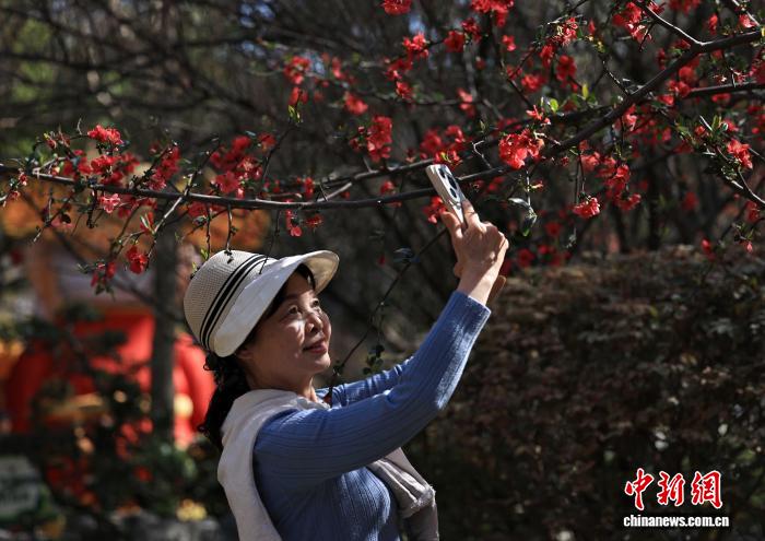 2月24日,成都市棠湖公園種植的5000余株海棠花開進(jìn)入觀賞期,吸引市民和游客前來賞花拍照。圖為一位女士用手機(jī)拍攝海棠花。 中新社記者 王磊 攝
