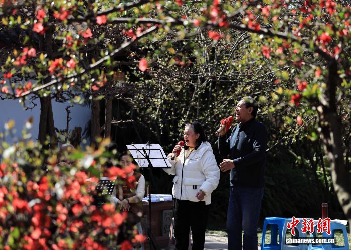 2月24日,成都市棠湖公園種植的5000余株海棠花開進(jìn)入觀賞期,吸引市民和游客前來賞花拍照。圖為市民在棠湖公園里練歌。 中新社記者 王磊 攝