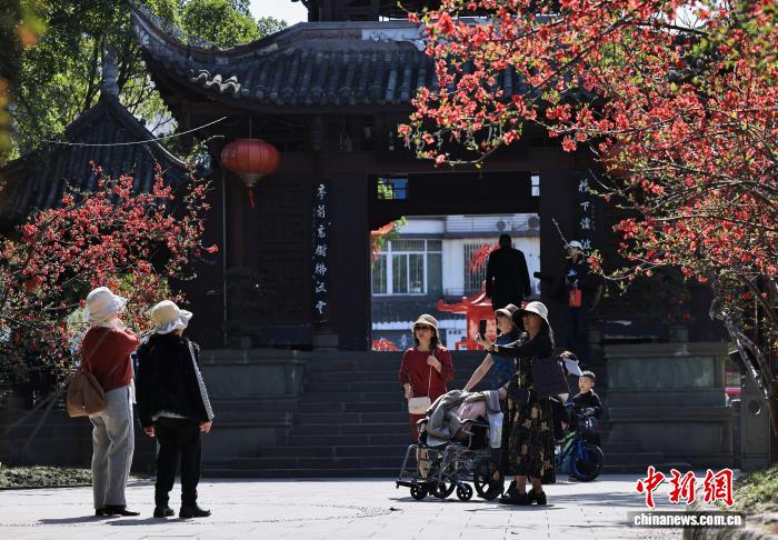 2月24日,成都市棠湖公園種植的5000余株海棠花開進(jìn)入觀賞期,吸引市民和游客前來賞花拍照。圖為游人在海棠樹下漫步休閑。中新社記者 王磊 攝