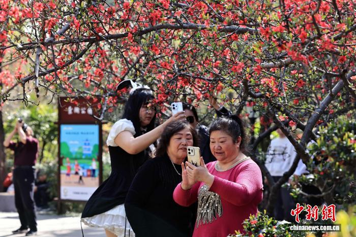 2月24日,成都市棠湖公園種植的5000余株海棠花開進(jìn)入觀賞期,吸引市民和游客前來賞花拍照。圖為游人在海棠樹下拍攝。 中新社記者 王磊 攝
