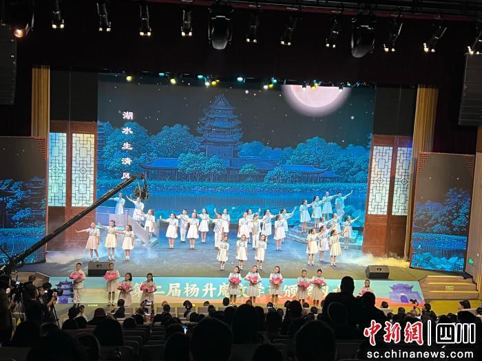 不同于傳統(tǒng)頒獎儀式,本次頒獎以四幕舞臺劇串聯(lián)起楊升庵的人生軌跡與精神脈絡(luò),成為全場亮點。從《少年風(fēng)華》開篇中24歲高中狀元、胸懷天下的青年才俊到《苦樂相隨》篇章里被貶云南、與夫人黃峨依依惜別的深情志士,再到《蜀云滇月》中在邊陲編書繪圖、促進民族融合的文人典范,最后以《夢歸新都》中70余歲仍心念故土的老者形象落幕,演員們用細膩的演繹,將楊升庵“臨利不敢先人,見義不敢后身”的人格操守與“文以載道,情以寄鄉(xiāng)”的文化情懷展現(xiàn)得淋漓盡致。此外,新都區(qū)繁江小學(xué)學(xué)生帶來的川劇戲歌《桂湖寄思》,以童聲演繹楊升庵詩詞,讓傳統(tǒng)文化在年輕一代中煥發(fā)新生。