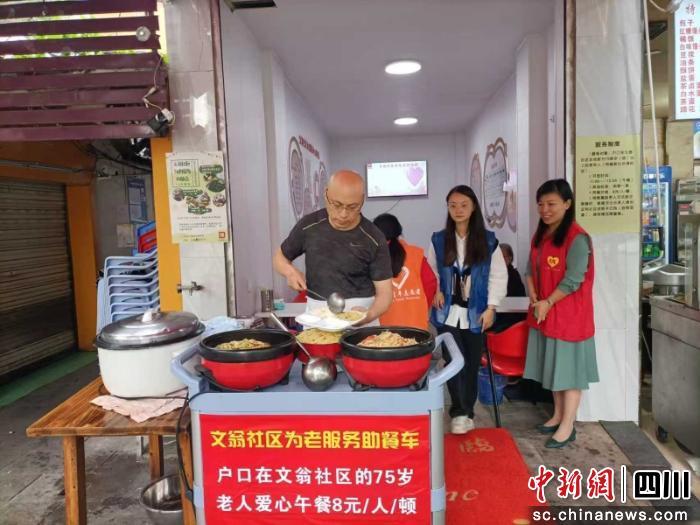文翁社區(qū)居委會(huì)主任孫玉鳳介紹,這一助餐點(diǎn)采用“社區(qū)合伙人”模式運(yùn)營(yíng)。社區(qū)通過(guò)前期走訪(fǎng)轄區(qū)餐飲商家,最終與“馬蹄花川菜館”達(dá)成合作。餐館老板馬涌主動(dòng)出資裝修場(chǎng)地、購(gòu)置餐車(chē)與餐具,共享廚房與人力,以成本價(jià)8元/餐的標(biāo)準(zhǔn),每日提供50份愛(ài)心午餐。