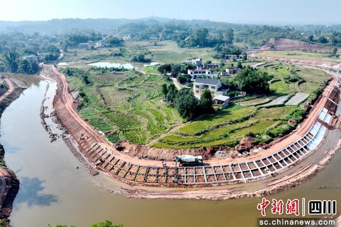中新網(wǎng)四川新聞10月15日電。ɡ罱埽┻B日來(lái),在瀘州瀘縣百和鎮(zhèn)大陸溪皂桷灘段防洪治理工程施工現(xiàn)場(chǎng),機(jī)械轟鳴、車(chē)來(lái)人往。
