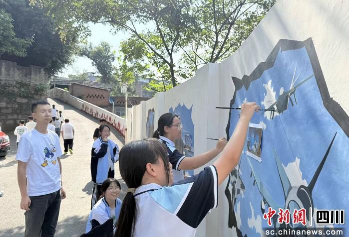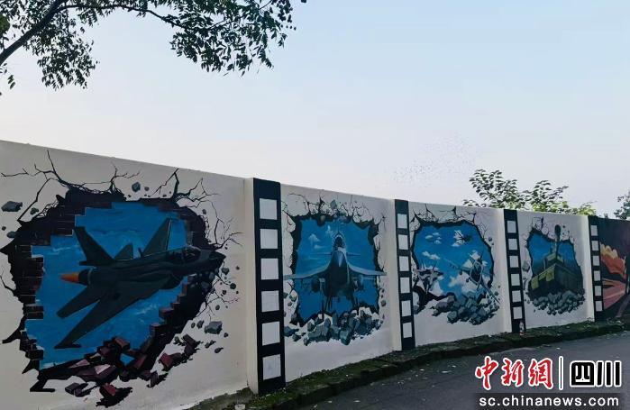 近日,自貢市富順縣城關(guān)中學(xué)開展了國防教育墻繪活動(dòng)。當(dāng)天,由學(xué)校師生共同構(gòu)思、繪制的國防主題墻繪震撼亮相,戰(zhàn)機(jī)、導(dǎo)彈、航母等國防重器破墻而出……