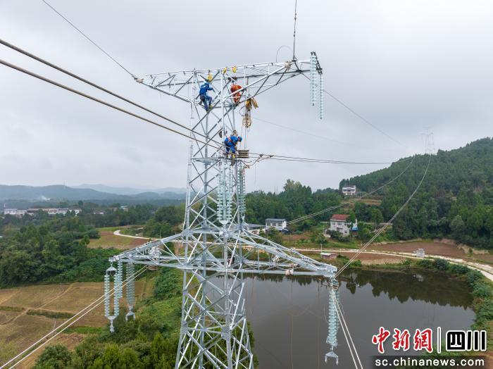 中新網四川新聞11月5日電 (王康力)11月4日,位于綿陽市梓潼縣的詩城—鹽亭220千伏線路工程現場,3名高空作業(yè)人員正在28米高的鐵塔上進行緊放線作業(yè)。這是國網綿陽供電公司奮力推進電網建設,做好迎峰度冬保供的一個縮影。