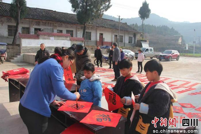 中新網(wǎng)四川新聞2月4日電。惾士担R年春節(jié)將至,為弘揚(yáng)中華優(yōu)秀傳統(tǒng)文化,營(yíng)造喜慶祥和的節(jié)日氛圍,把最真摯的新春祝福送到村民家門(mén)口。2月3日,綿陽(yáng)市梓潼縣仁和鎮(zhèn)里仁村駐村書(shū)記劉滟琳主動(dòng)牽頭,精心策劃,邀請(qǐng)書(shū)法愛(ài)好者共同組成“送福小分隊(duì)”,在里仁村村委會(huì)院壩中開(kāi)展“迎新春、寫(xiě)春聯(lián)、送祝!惫婊顒(dòng),以筆墨寄心意,以春聯(lián)聚民心。