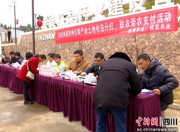 分紅現(xiàn)場(chǎng),長(zhǎng)桌一字排開(kāi),成捆現(xiàn)金整齊碼放,三臺(tái)驗(yàn)鈔機(jī)不停運(yùn)轉(zhuǎn)。四川省勝男農(nóng)業(yè)開(kāi)發(fā)有限公司工作人員逐一核對(duì)名單、發(fā)放款項(xiàng),村民們簽字、按印、領(lǐng)錢(qián),笑意盈盈。除了現(xiàn)金,每戶村民還額外領(lǐng)到一罐由基地紅梨熬制的“曌梨”小碗梨。
