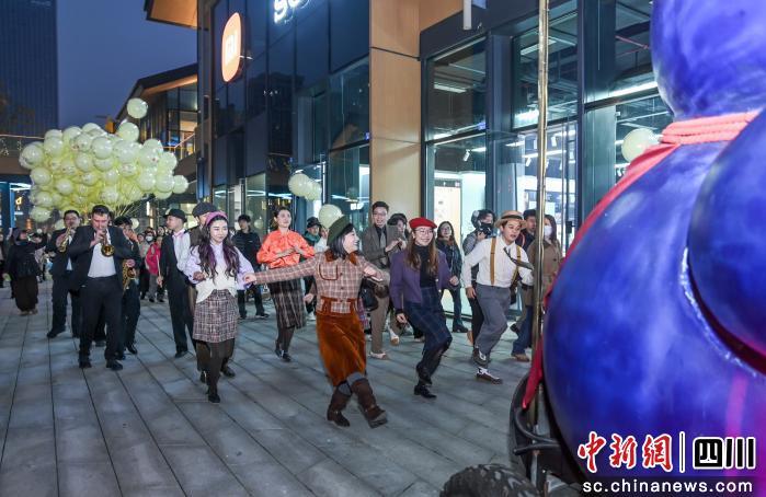 隨著亮燈儀式結(jié)束,“煙火巡游”活動的熱情迅速蔓延整個公園:西洋管樂大隊奏響經(jīng)典爵士旋律,復(fù)古裝扮的搖擺舞者邀約市民共舞;大型互動裝置招財貓化身移動“許愿池”,沿商業(yè)街中軸線開展夜巡合照。無數(shù)溫暖的橙黃色光點點綴在街巷之間,構(gòu)成一幅幅動人的冬日夜景,藝術(shù)與城市煙火在此刻共生共融。