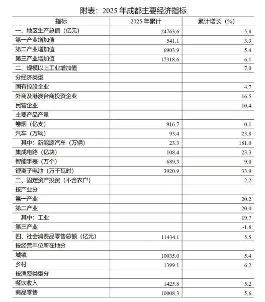 1月23日,成都市統(tǒng)計局對外發(fā)布成都2025年經(jīng)濟運行數(shù)據(jù):根據(jù)地區(qū)生產(chǎn)總值統(tǒng)一核算結(jié)果,2025年,成都全市實現(xiàn)地區(qū)生產(chǎn)總值24763.6億元,按不變價格計算,比上年增長5.8%。分產(chǎn)業(yè)看,第一產(chǎn)業(yè)增加值541.1億元,增長3.3%;第二產(chǎn)業(yè)增加值6903.9億元,增長5.4%;第三產(chǎn)業(yè)增加值17318.6億元,增長6.1%。經(jīng)濟景氣度稅電指數(shù)為104.1,其中生產(chǎn)指數(shù)為104.6,銷售指數(shù)為103.3。