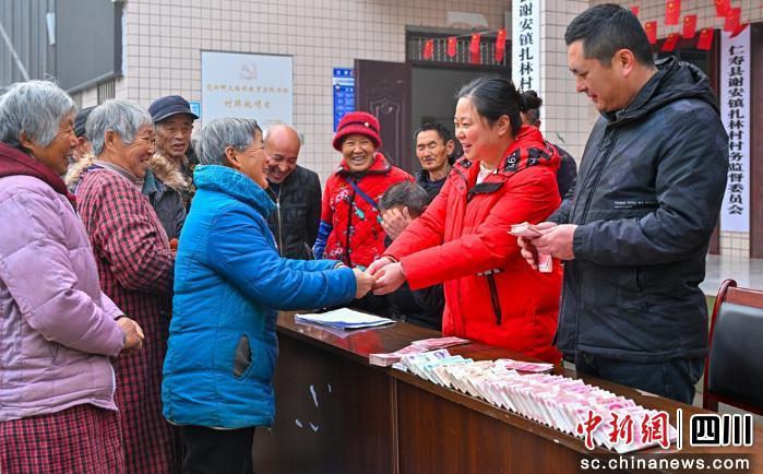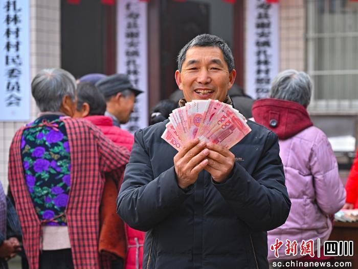 中新網(wǎng)四川新聞2月13日電 (劉忠俊 郭僑 劉潤紅)春節(jié)前夕,眉山市仁壽縣謝安鎮(zhèn)扎林村一場承載著全村人期盼的集體經(jīng)濟分紅大會熱鬧啟幕,一沓沓嶄新的鈔票,正化作實實在在的幸福,送到每一位村民手中。“2025年,咱們村集體經(jīng)濟收入達32萬元!”扎林村黨總支書記張大志一邊麻利地登記分紅名單,一邊抬高聲音向村民報喜,“這錢,是咱們?nèi)迦说男耐惶幭搿磐惶幨梗瑢嵈驅嵏沙鰜淼,更是咱們扎林村鄉(xiāng)村振興的‘成績單’!
