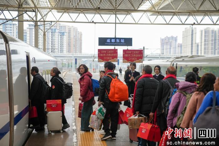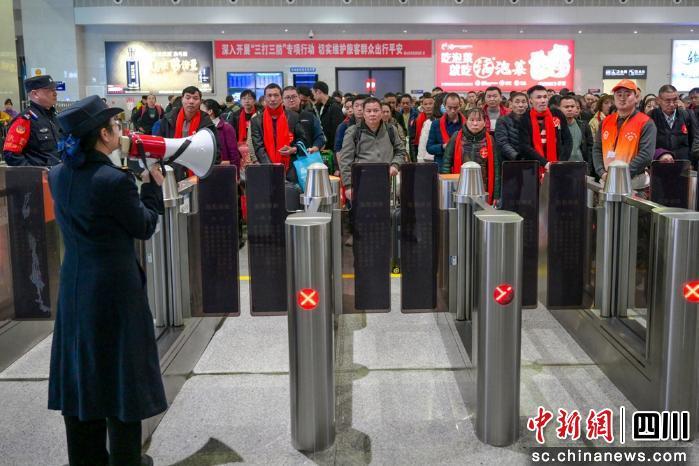成都東站候車大廳內(nèi),鐵路部門為務(wù)工人員開設(shè)綠色通道,大家有序候車、檢票,現(xiàn)場(chǎng)秩序井然。站臺(tái)上,隨著列車一聲鳴笛,這列滿載著家鄉(xiāng)囑托與務(wù)工人員希望的專列緩緩啟動(dòng),一路向南奔赴廣東,正式開啟新一年的打拼之旅!斑@趟專列共搭載760余名川籍務(wù)工人員,我們提前摸排客流信息,從候車、檢票到乘車全程提供貼心服務(wù),全力保障務(wù)工人員平安順利出行!背啥紪|站客運(yùn)科科長(zhǎng)鄢鷗介紹。