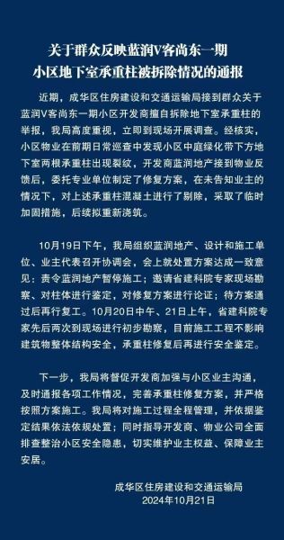 10月21日,成都市成華區(qū)住房建設(shè)和交通運(yùn)輸局發(fā)布關(guān)于群眾反映藍(lán)潤(rùn)V客尚東一期小區(qū)地下室承重柱被拆除情況的通報(bào)。具體內(nèi)容如下: