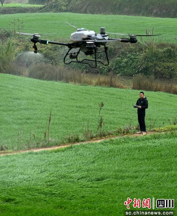 “嗡嗡嗡.....”無人機(jī)螺旋槳的嗡鳴聲在田野上空響起。種植大戶王子均正操作著遙控器,指揮無人機(jī)進(jìn)行飛防作業(yè)。霧化的“越冬營養(yǎng)包”均勻灑向麥田,為小麥安全越冬增添保障。