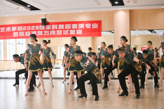 9月12日,成都體育學(xué)院藝德大樓2樓舞蹈房,《叢蜀·三星》緊張排練中。記者在現(xiàn)場(chǎng)看到:從遠(yuǎn)古傳來(lái)一聲又一聲神秘呼喊,古蜀先民仰望著天雄姿英發(fā),在金色權(quán)杖帶領(lǐng)下干戈征戰(zhàn),斗出個(gè)滿地黃金,在三星堆開啟了神秘璀璨古老文明。主創(chuàng)團(tuán)隊(duì)成員、成都體育學(xué)院藝術(shù)學(xué)院副教授喻嬋介紹,作品大膽運(yùn)用拉丁舞詮釋青銅文明的古老神秘,拉丁舞的爆發(fā)力與古蜀祭祀的莊重相結(jié)合,凸顯文化交融莊重與熱烈,扭頭動(dòng)作的靈感來(lái)源三星堆“青銅跪坐扭頭人像”,又融于拉丁的甩頭與旋轉(zhuǎn),實(shí)現(xiàn)了考古特征與現(xiàn)代編舞的融合。這不僅是一次藝術(shù)創(chuàng)新,更表明成都作為歷史文化名城,正以開放姿態(tài)邀請(qǐng)世界共讀它的文明密碼。據(jù)悉,該節(jié)目從構(gòu)思到最終成型歷時(shí)近3年,主創(chuàng)團(tuán)隊(duì)全部由學(xué)院師生組成。