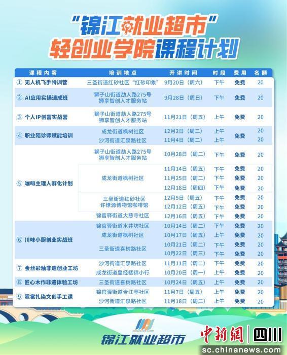 “錦江就業(yè)超市”輕創(chuàng)業(yè)學(xué)院暨職業(yè)技能進(jìn)社區(qū)活動(dòng)從9月20日到12月18日,21節(jié)干貨課全免費(fèi),9個(gè)培訓(xùn)地點(diǎn)覆蓋錦江區(qū)。