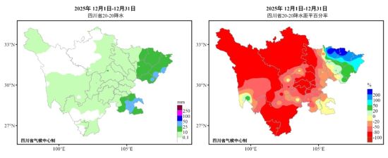 氣象監(jiān)測顯示,2025年12月全省平均降水量5.7毫米,較常年同期偏少42%,位列歷史同期第10少。全省156個國家氣象觀測站中有39站無降水,主要分布在攀西地區(qū)和川西高原。與常年同期相比,盆地東北部和川西高原西南部降水偏多,其余大部偏少。