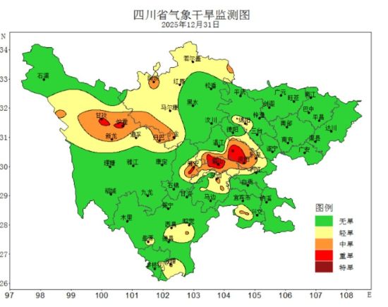 目前,氣象干旱主要出現(xiàn)在川西高原中部和盆地西部部分地區(qū),從全省看整體上不明顯。據(jù)2025年12月31日氣象干旱綜合指數(shù)監(jiān)測,在全省156個國家氣象觀測站中,有52站存在氣象干旱,其中輕旱17站、中旱23站、重旱10站、特旱2站。重度以上氣象干旱主要分布在川西高原中部以及盆地西部成都、雅安和眉山3市,重旱為蒲江、邛崍、簡陽、甘孜、爐霍、丹棱、彭山、滎經(jīng)、雅安、雁江,特旱為東坡、龍泉驛。