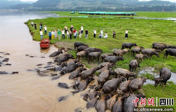 “百牛渡江”生態(tài)奇觀是蓬安“文旅+生態(tài)”的核心IP。雙節(jié)期間,百牛渡江景區(qū)吸引大批游客前來(lái)打卡。清晨8點(diǎn)30分,景區(qū)的望江樓擠滿(mǎn)觀景的游客。隨著一聲呼哨,數(shù)百頭水牛破波斬浪,沖向江心太陽(yáng)島。江面上水花翻涌、牧歌回蕩,觀景平臺(tái)上快門(mén)聲此起彼伏。